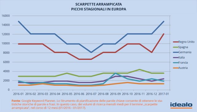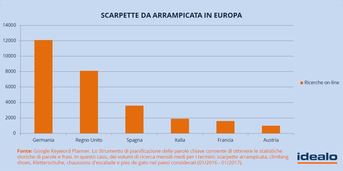 I dati estrapolati dal Google Keywords Tool (Adwords) sono stati poi normalizzati tramite il calcolo della mediana dei valori mensili relativi al periodo di tempo compreso tra Ottobre 2016 e Gennaio 2017. Le intenzioni d’acquisto sono state calcolate sulla base delle ricerche effettuate, che si sono convertite in click per finalizzare l’acquisto. Nel periodo considerato, idealo ha analizzato un campione di oltre 1.150.000 ricerche effettuate dai 12 milioni di utenti unici in Europa. L’analisi è stata condotta su oltre 65.000 prodotti in catalogo. È stato così possibile ottenere l’indicazione dei volumi medi di ricerca mensile nel periodo Gennaio 2016-Gennaio 2017. Si è quindi notato che, per esempio per quanto riguarda le “scarpe di arrampicata”, tra le quattro nazioni, l’Italia è al quarto posto per interesse al tema, con circa 1.850 ricerche medie mensili, prima di Francia e Austria e dopo Germania, Gran Bretagna e Spagna, con picchi di attenzione soprattutto nei mesi di settembre e ottobre.