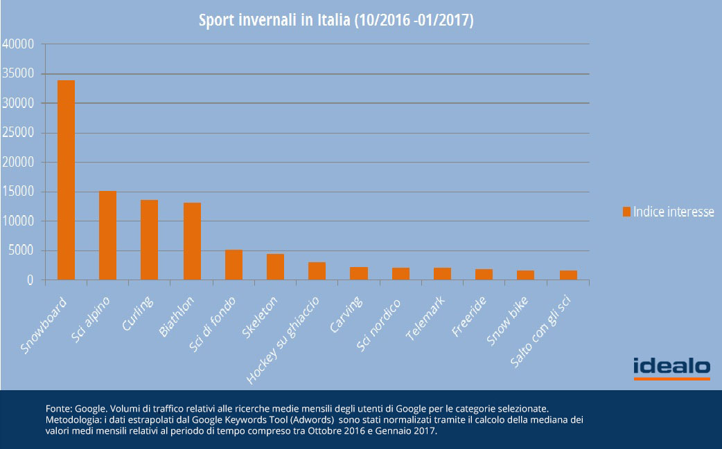 Questo spiega, per esempio, il boom di acquisti di prodotti legati agli sport invernali, che nel loro complesso, come ricordato, rappresentano il primo sport nelle ricerche per acquisti su internet. All’interno di questa grande categoria, poi, troviamo pratiche particolari o di nicchia. Al primo posto tra gli sport invernali più cliccati dagli utenti, per esempio, troviamo lo snowboard, sul podio insieme allo sci alpino e al curling. Seguono poi biathlon (disciplina che combina tiro a segno con la carabina e sci di fondo), sci di fondo, skeleton (discesa su pista ghiacciata con uno slittino in posizione prona), hockey su ghiaccio, carving (sci da discesa, corto e largo), sci nordico, telemark (o sci a tallone libero) freeride (meglio noto come “fuoripista”), snowbike e salto con gli sci. La classifica denota quindi anche una certa propensione, o quanto meno un’attenzione, da parte del nostro paese verso tutto ciò che è particolare e adrenalinico.
