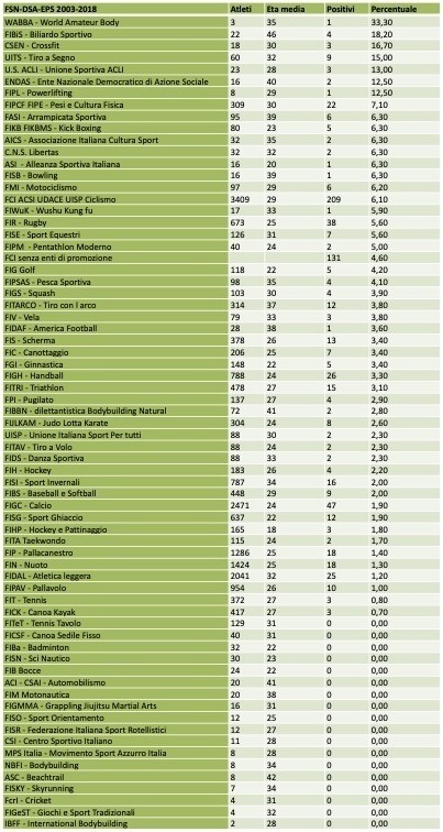 La tabella mostra i controlli realizzati dall’agenzia dal 2003 al 2018 e i positivi per ogni singolo sport o federazione.