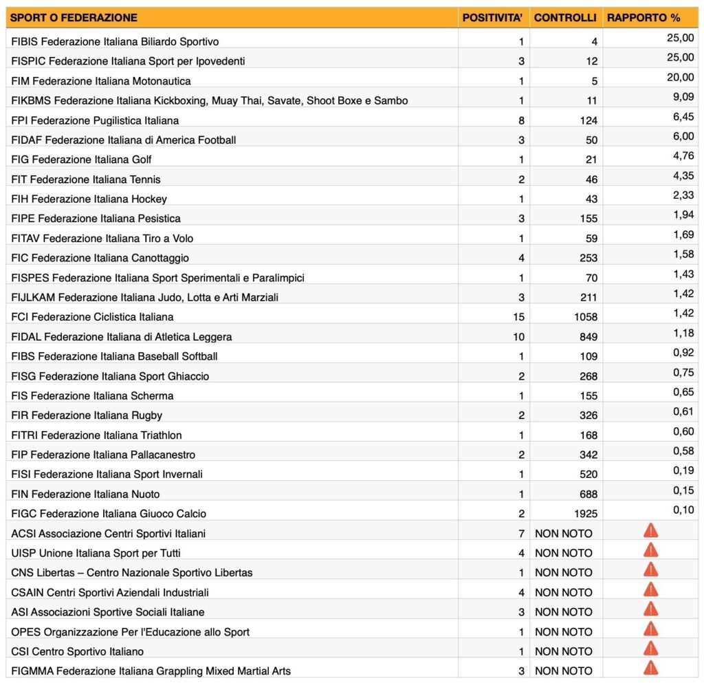 Se non trovate qualche sport è perché, a fronte di controlli, non sono stati rilevati casi. Lì dove è presente il termine “non noto” è perché l’ente non ha dichiarato quanti controlli sono stati realizzati ed è quindi impossibile calcolare la percentuale di positività.